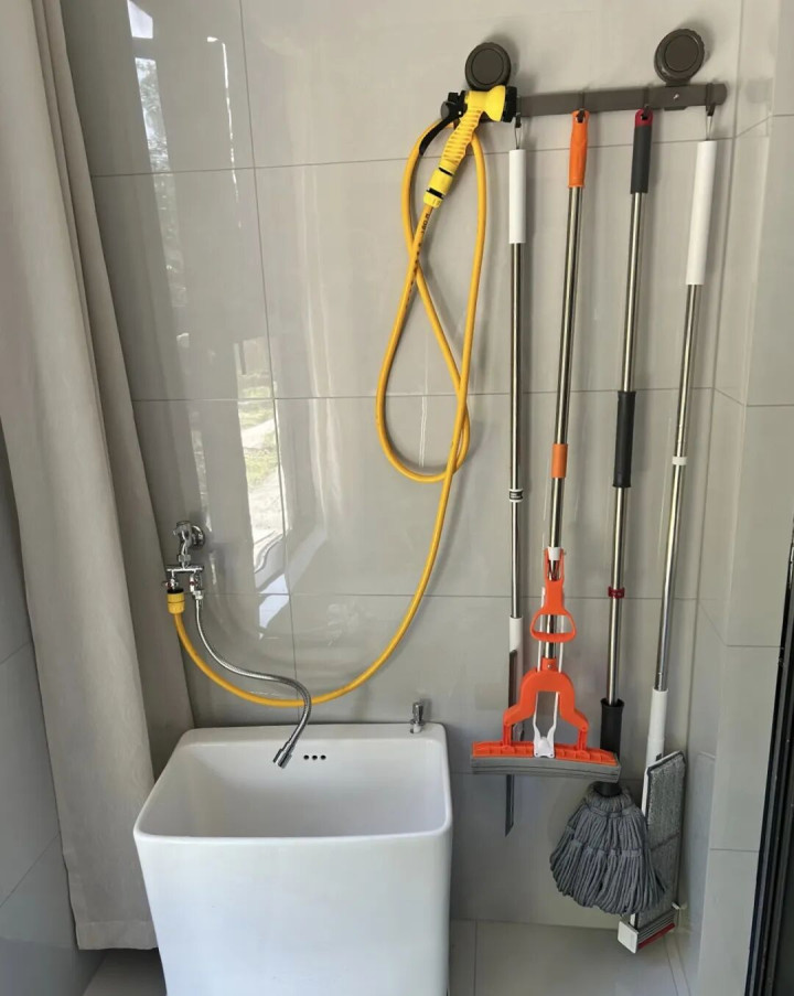 如果家里空间有限,不得不把它们放在卫生间里的话,记得学会点“高阶存放术”:拿个挂钩,把它们悬空挂起,和地面保持点距离,避免和地面“亲密接触”,这样就算卫生间湿漉漉的,扫把拖把也能依旧清爽如初,跟细菌say no!